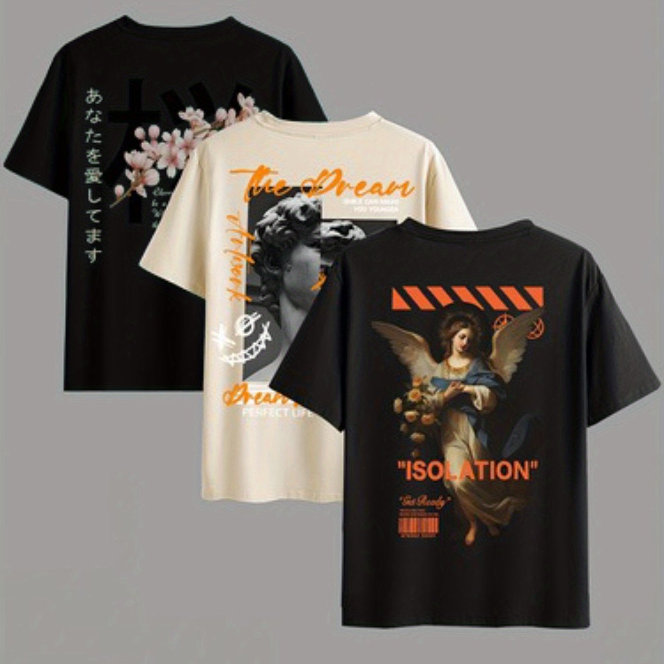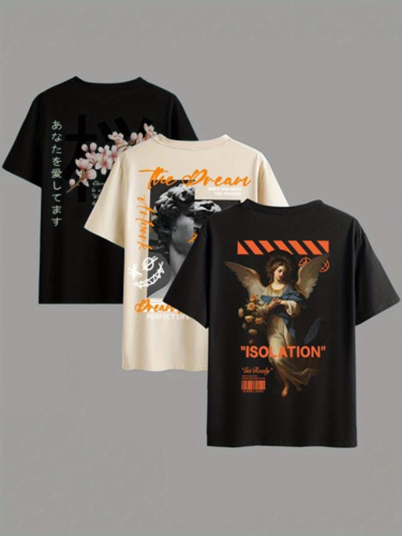 3pcs Men's Graphic T-Shirts - Artistic 'True Dream' Floral, Greek Statue & 'Isolation' Angel Design, Japanese Text, Soft Cotton Blend, Regular Fit Short Sleeve for Casual Summer Wear, Leisure Clothing | Modern Artistic Tee | Durable Print Quality