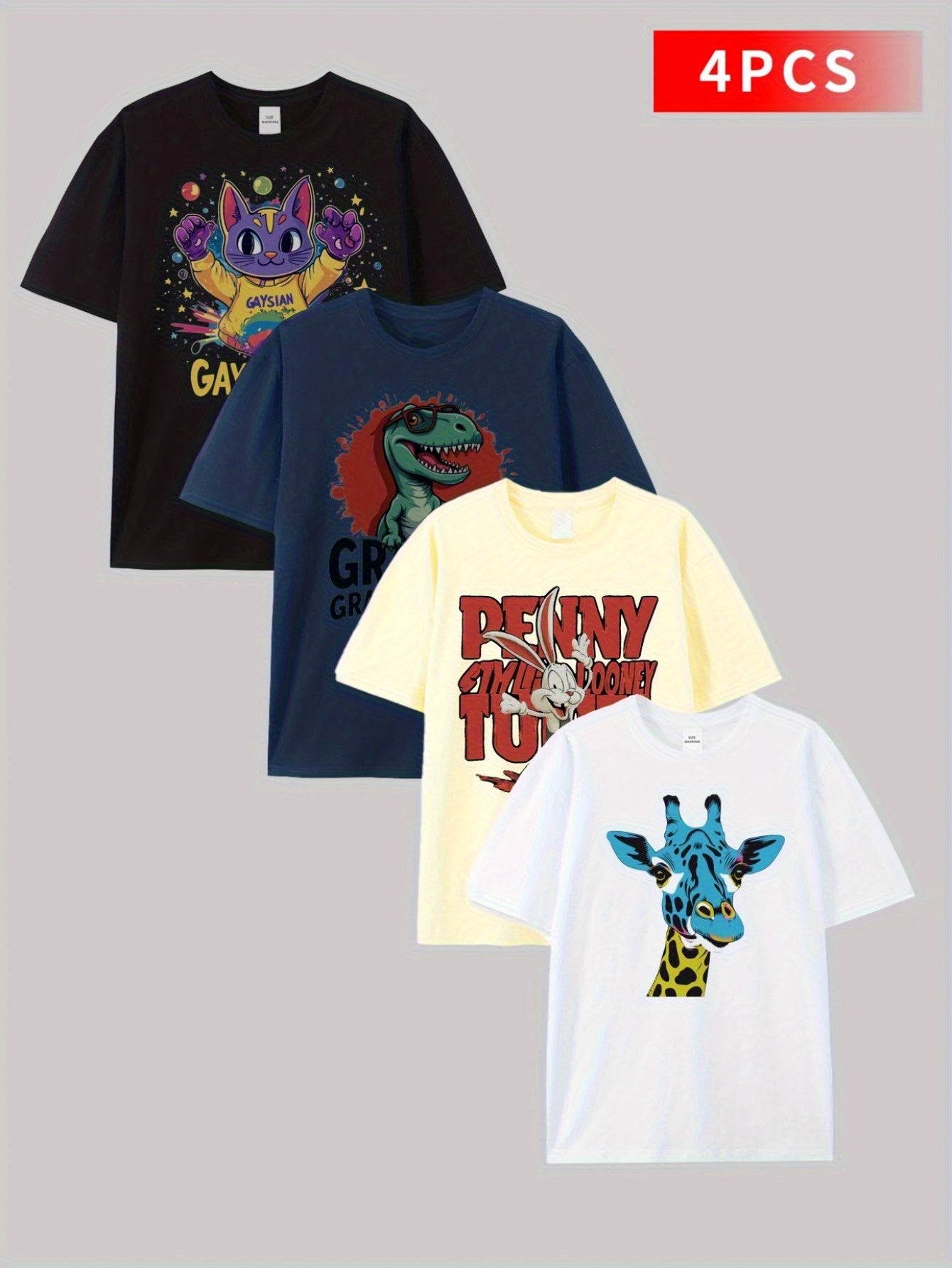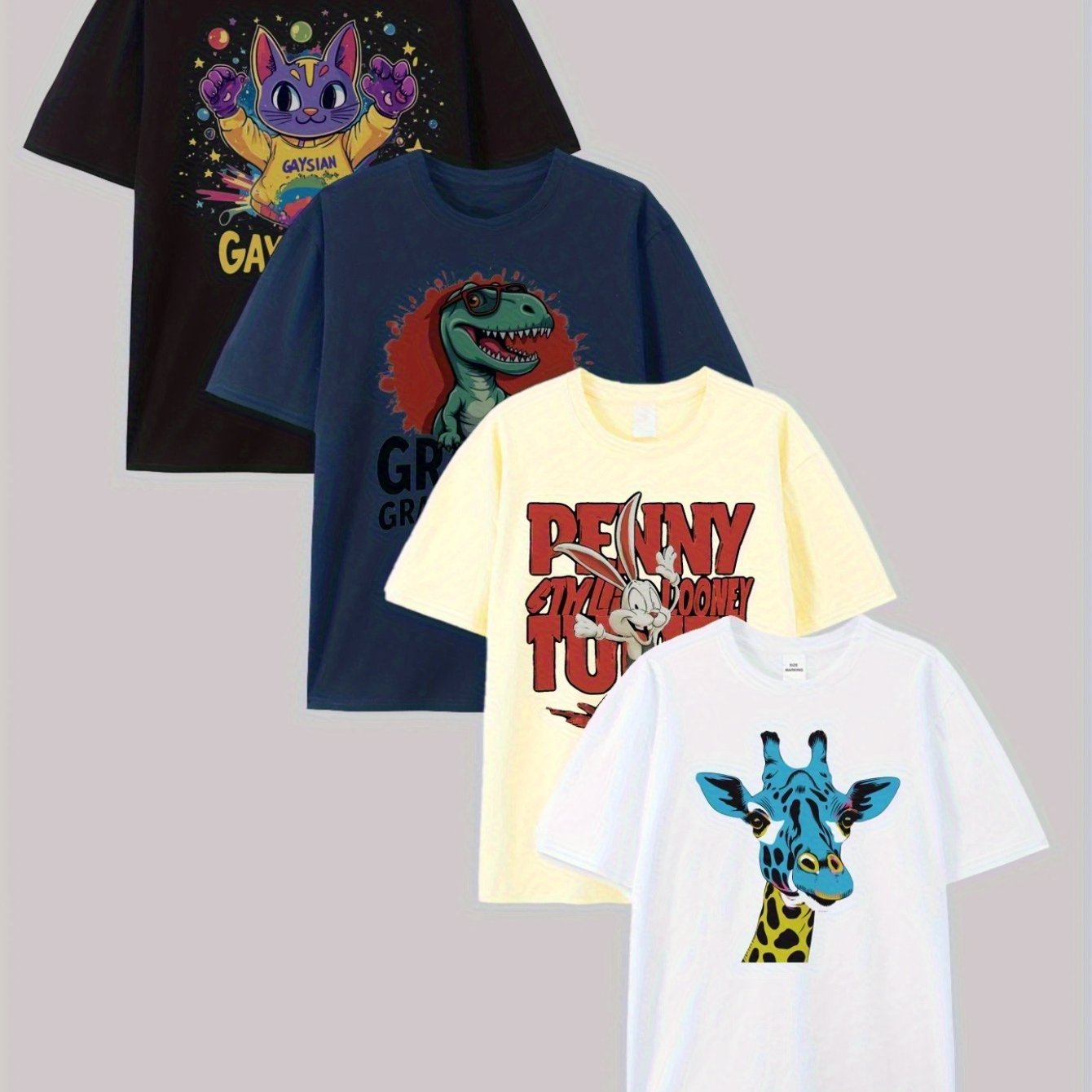 4pcs Men'S Cotton T-Shirts - Fun Cartoon Print, Soft & Breathable, Loose Fit, Short Sleeve, Round Neck, 220g\u002F㎡, Perfect for Casual Summer Wear, Machine Washable, Casual Summer Wear | Playful Graphic Tee | Soft Cotton Tee