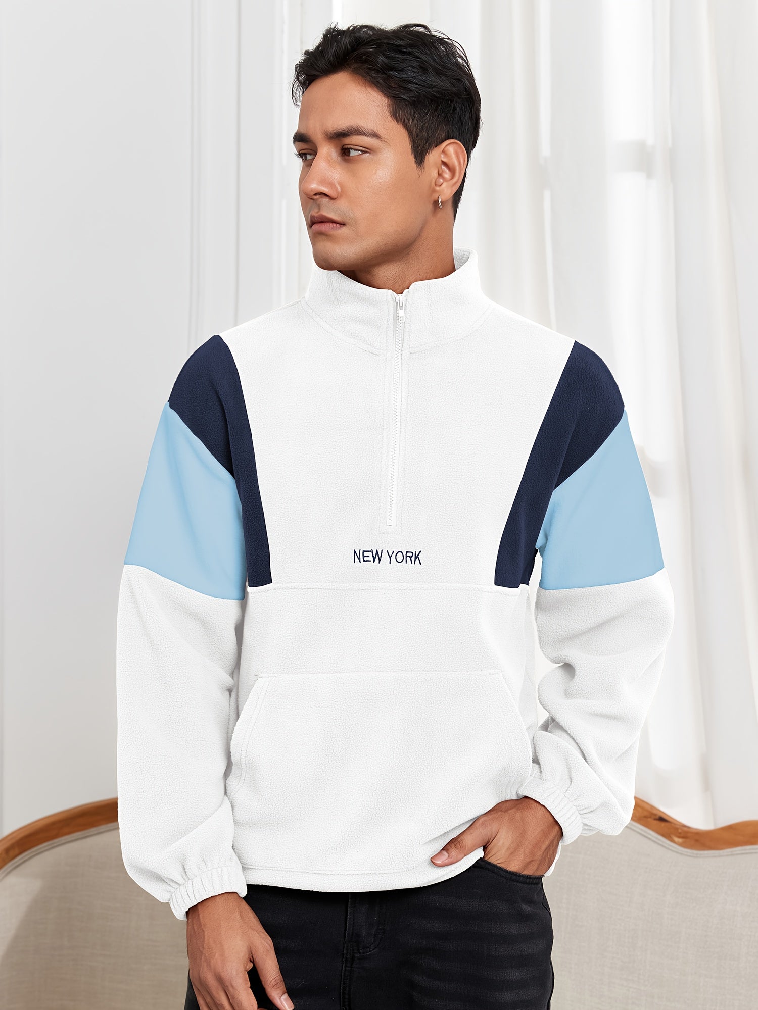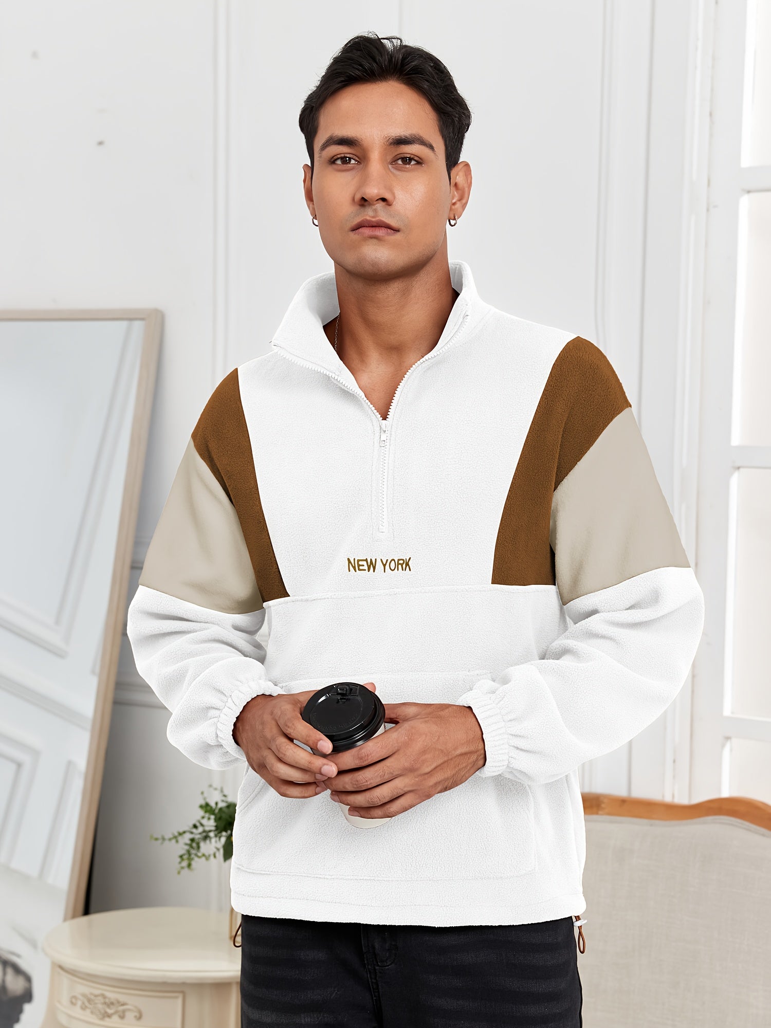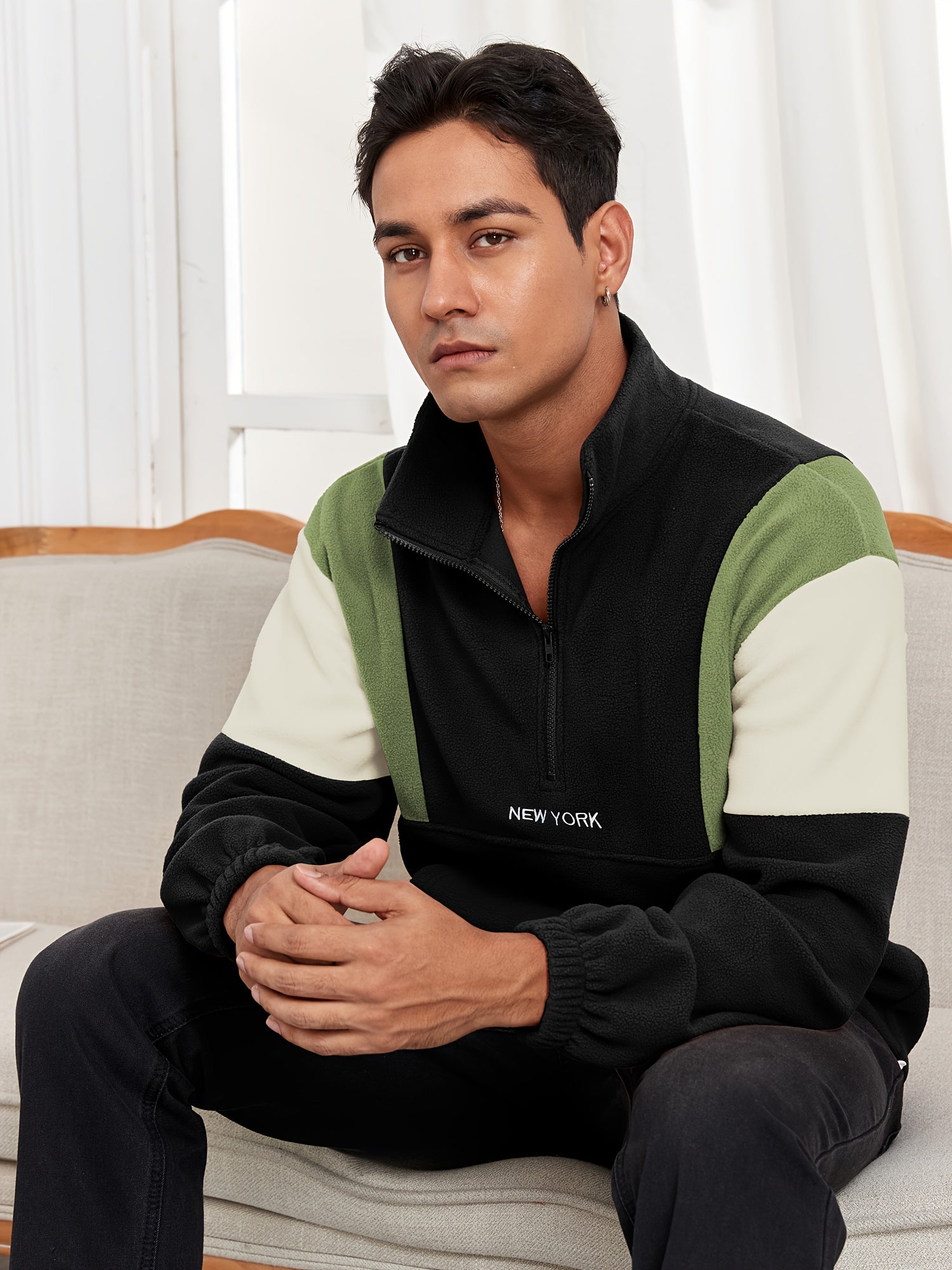 Men's Fluffy Polar Fleece Hoodie with NEW YORK Lettering & Colorblock Design - Half-Zip Stand Collar Sweatshirt, Loose Fit Unisex Pullover for Casual & Athletic Wear, Machine Washable (Black\u002FOlive\u002FBeige)