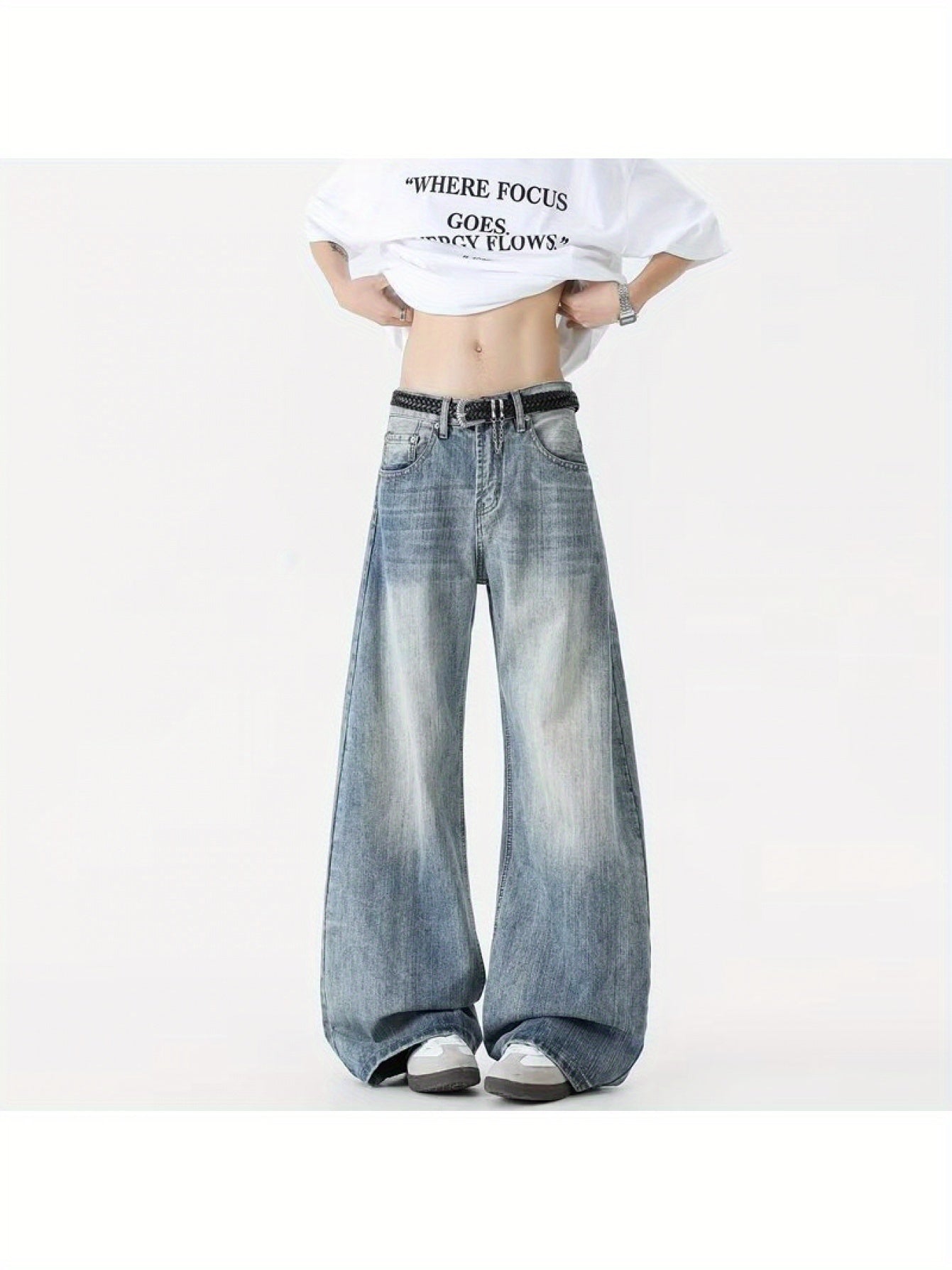 Men'S High-Waisted Wide-Leg Jeans - Vintage Washed Blue Denim, Casual Summer Style with Belt Loops & Pockets, Comfortable Mid-Rise Fit for Casual Attire
